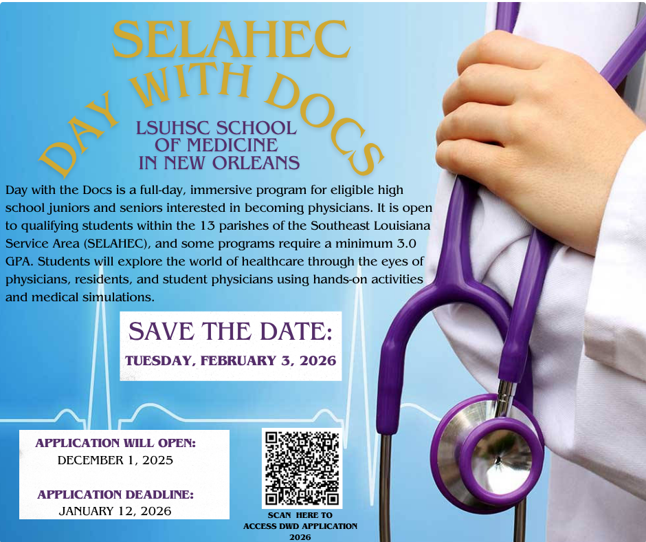 Day with the Docs gives students who are serious about becoming physicians, a chance to see what life is like as a medical student and get an up-close look at LSUHSC School of Medicine in New Orleans.  This event is coordinated by second year medical students and is co-sponsored by SELAHEC, the public school systems of participating parishes, in partnership with the LSUHSC School of Medicine. Parishes in the SE region are invited to participate on a rotating basis